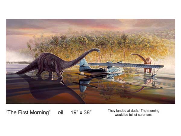 ”Cecil, (juror John Cecil, exhibition designer for the National Hispanic Cultural Center), chose John Grow’s oil painting “In The Beginning Was The Word” as Best of Show...This picture belies any theory that this is an experimental show. It couldn’t be more trad...showing 17 tightly painted angels flying through clouds with 12 dinosaurs. They’re surrounded with symbolic alphabet blocks, a birthday cake, a golden egg, a globe and a book. Everything old is new again.